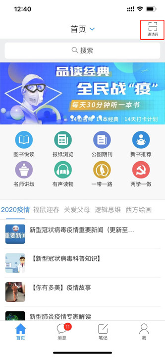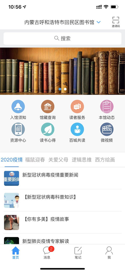 登录以后输入姓名即可-点击首页-点击右上角邀请码输入“ihshmq”即可进入到呼和浩特市回民区图书馆的首页。