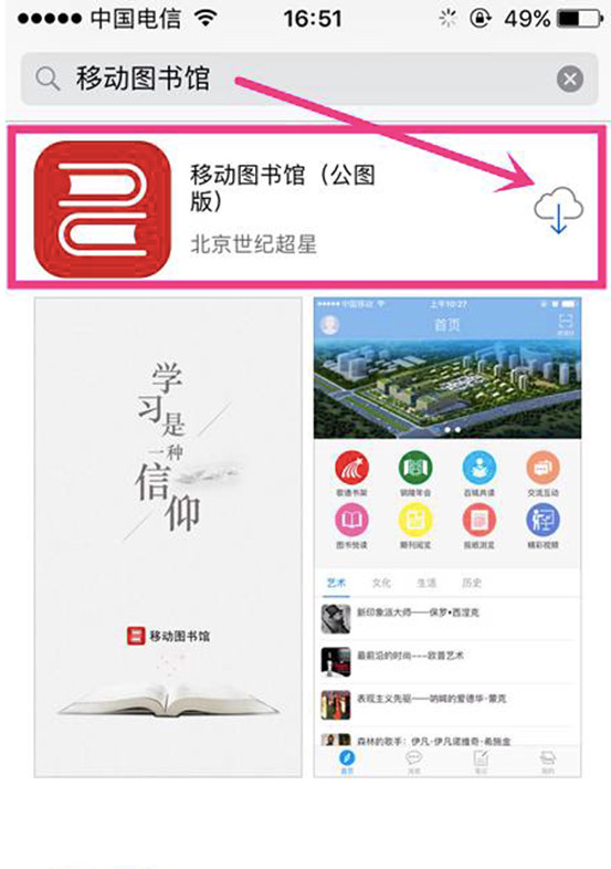 1、方式一、先去苹果或安卓的应用市场直接搜索“移动图书馆”,找到移动图书馆公图版下载即可,如下图所示: